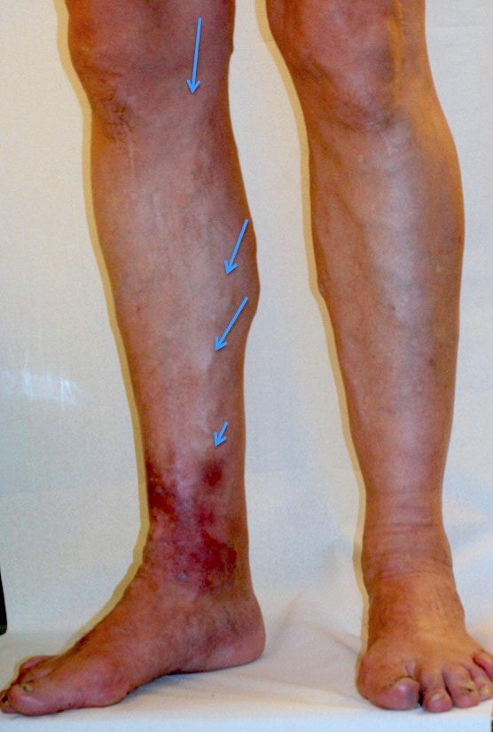 Lorsque les télangiectasies sont regroupées en péripherie et constituent des « placards » , elles signent une hypertension veineuse ou congestion qui merite attention , car cette accumulation de pression abime les tissus et finit quelque fois par constituer des zônes ou la peau guerit lentement en cas de blessure ou surviennent des ulcères . Elle provient généralement d’une dysfonction des axes veineux superficiels ( veines saphènes ) ou profonds et peuvent être associés à des ralentissements ou obstructions du reseau artériel . Un état des lieux est primordial avant toute action .